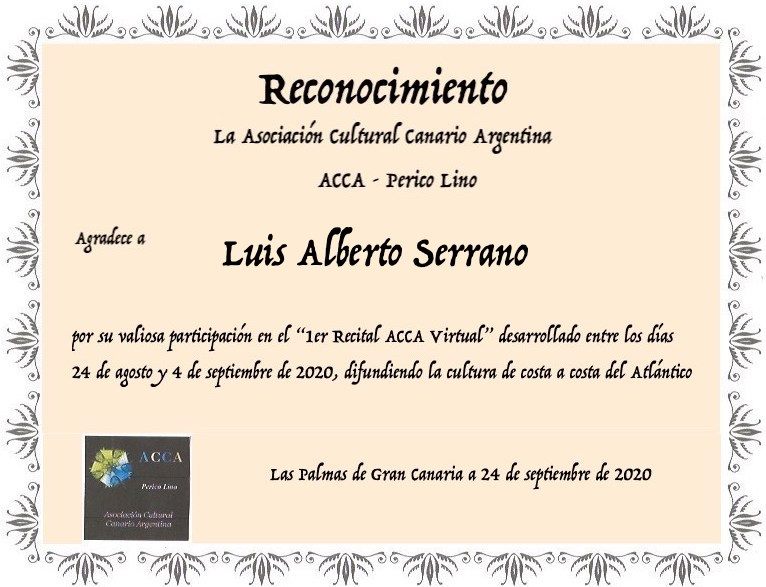 Asociación ACCA Perico Lino, Alberto Chain, Jose Lantigua, María Hernández, Jorge Honaine y a todos los canarios radicados en Argentina.