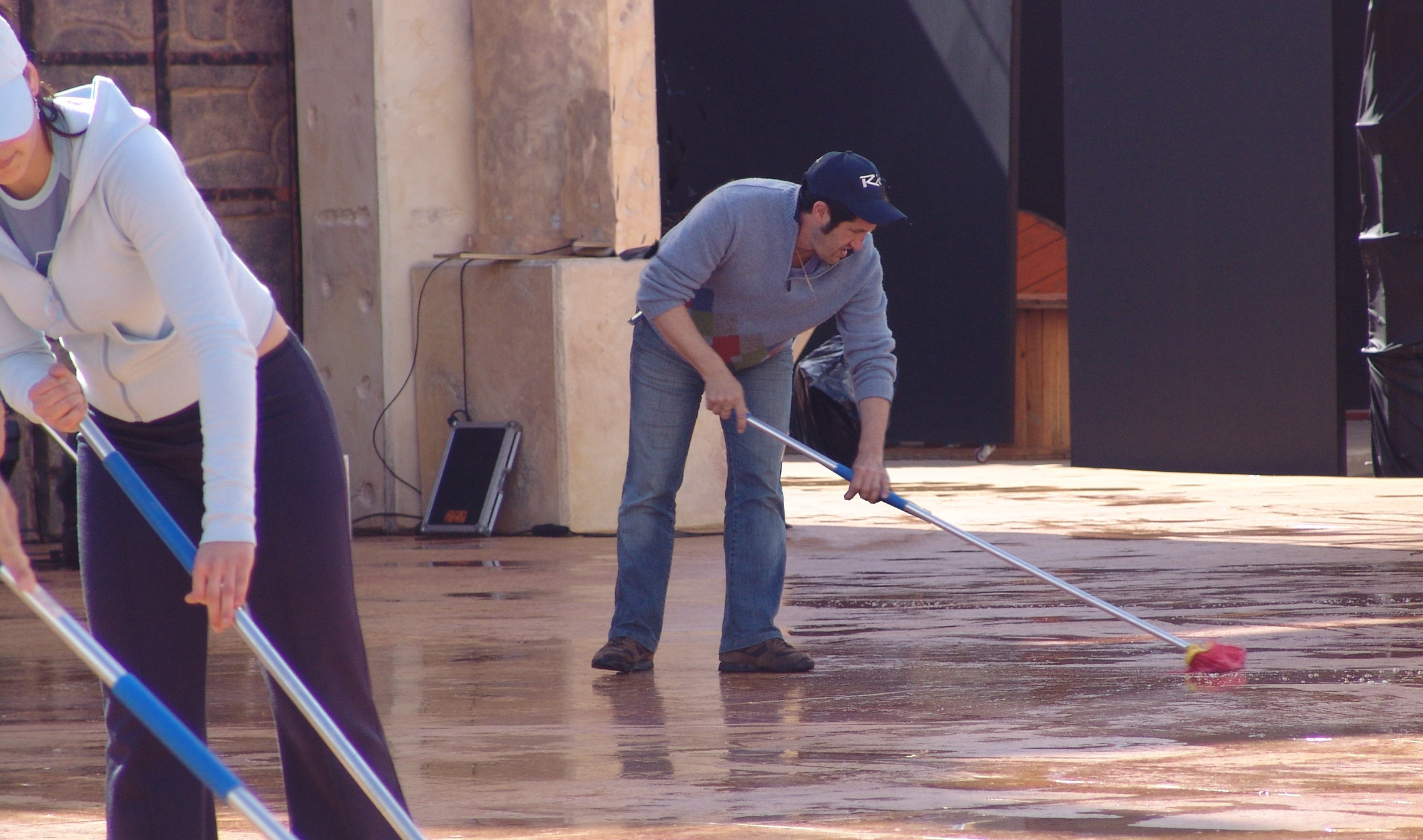 El día de la gala nos encontramos con que los caballos patinaban (como lo hicieron algunos bailarines durante el espectáculo). Soluciones de urgencias. Echar refresco de cola en el suelo para que se quedaran las pisadas adheridas y todos, yo el primero, nos pusimos a fregar el escenario y a esparcir el líquido pegajoso. No surtió efecto y los caballos no pudieron salir. Nadie se vino abajo hasta el final. Estuvimos todos a una. Y yo, orgulloso de todo ese equipo de bailarinas y ayudantes que cogieron las fregonas y, por lo menos, lo intentamos.