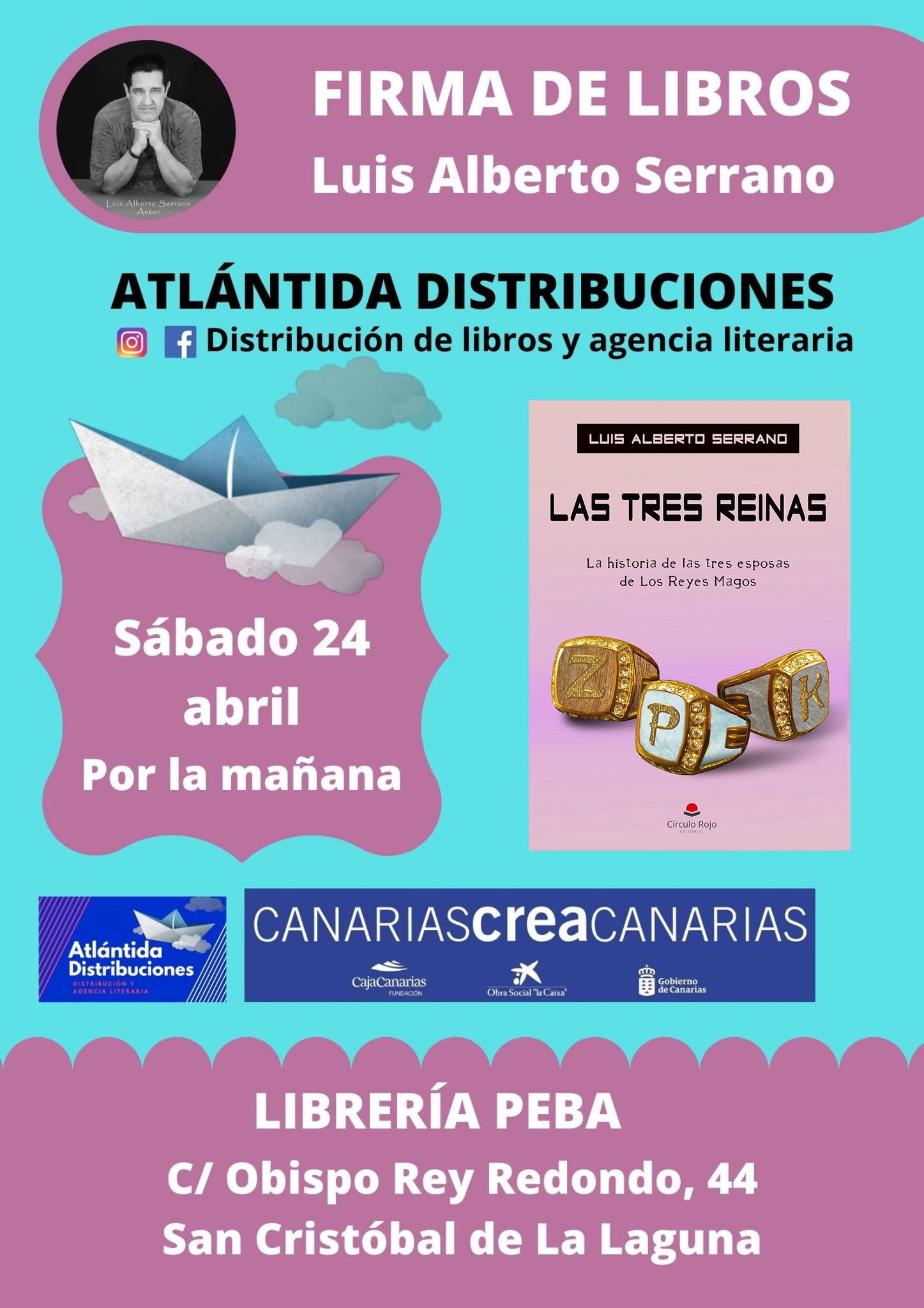 Firma de libros en La Laguna (Tenerife) 20 abril, 202126 abril, 2021 / Luis Alberto Serrano Realizaré una firma de libros de la novela LAS TRES REINAS en la Librería PEBA de San Cristóbal de La Laguna el próximo sábado 24 durante toda la mañana de la mano de Atlántida Distribuciones. Tu voto:Compártelo: Haz clic para compartir en X (Se abre en una ventana nueva) X Haz clic para compartir en Facebook (Se abre en una ventana nueva) Facebook Me gusta Cargando... Relacionado