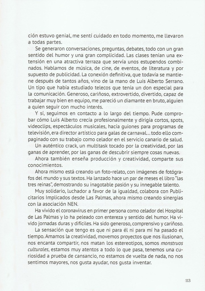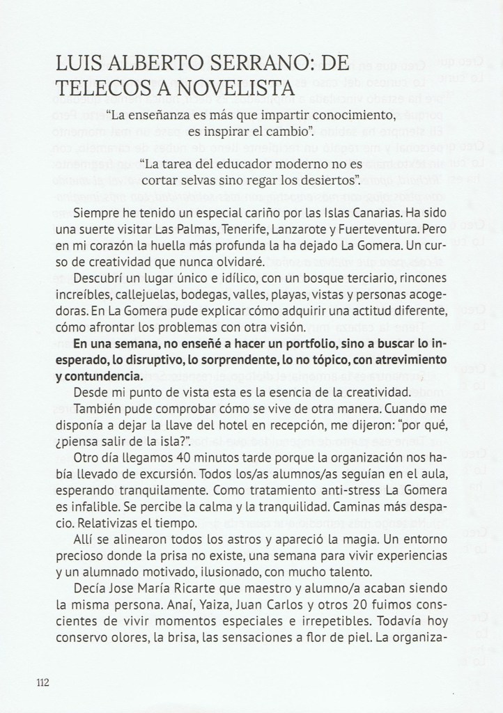 Tras el curso, desarrollado en la isla de La Gomera, me «adoptó» como alumno y me empezó a mandar leerme libros para luego comentarlos. Esos libros se convirtieron en mis biblias y sus doctrinas las he llevado a rajatabla en todas las disciplinas en las que he realizado creaciones (publicidad, cine, musicales, literatura). El supo convertirme el «alguien diferente» con las reglas de la disrupción.